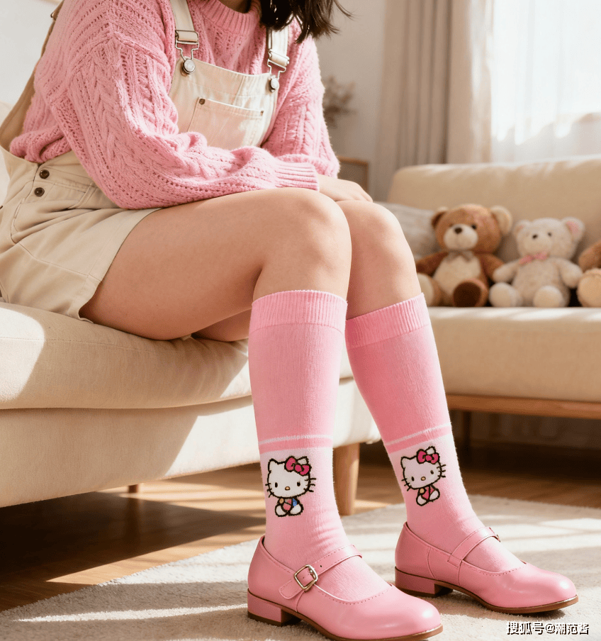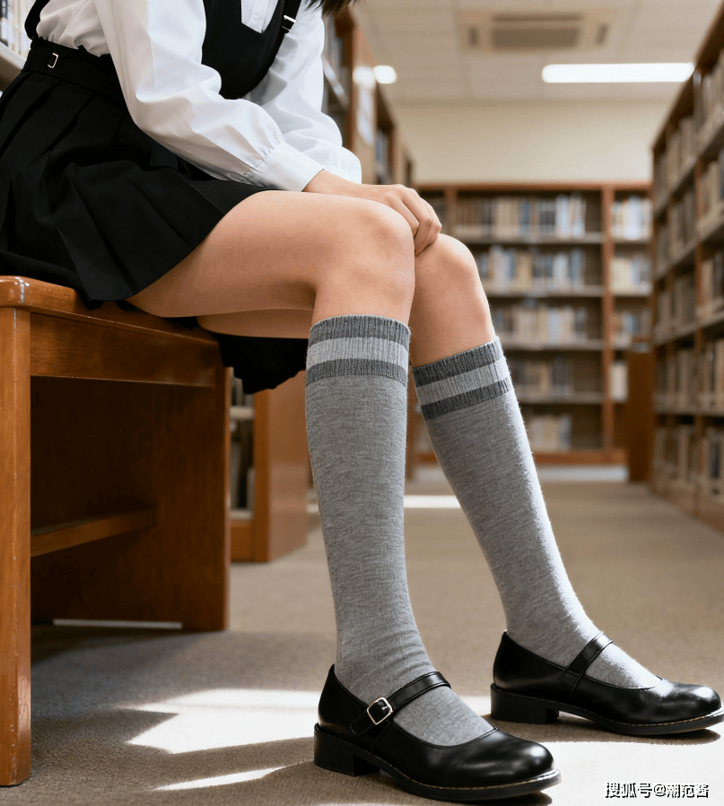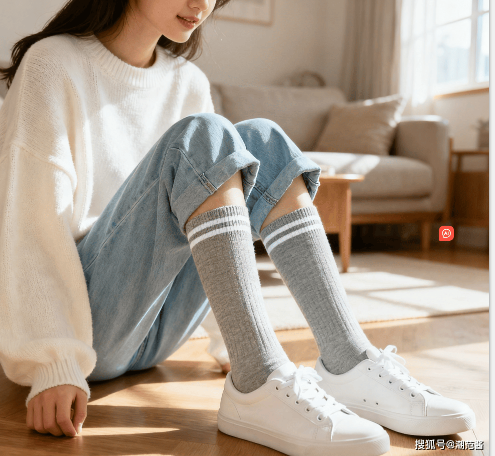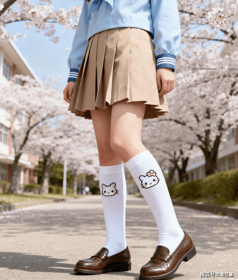 奶白色中筒袜 + 棕色乐福鞋 + 卡其百褶裙,袜子长度控制在小腿下 5cm,露出一截肌肤更显腿细。搭配米色针织开衫,随手拎个帆布包,秒变日剧女主。细节加分项:选带细微条纹的袜子,比纯色更有层次感。