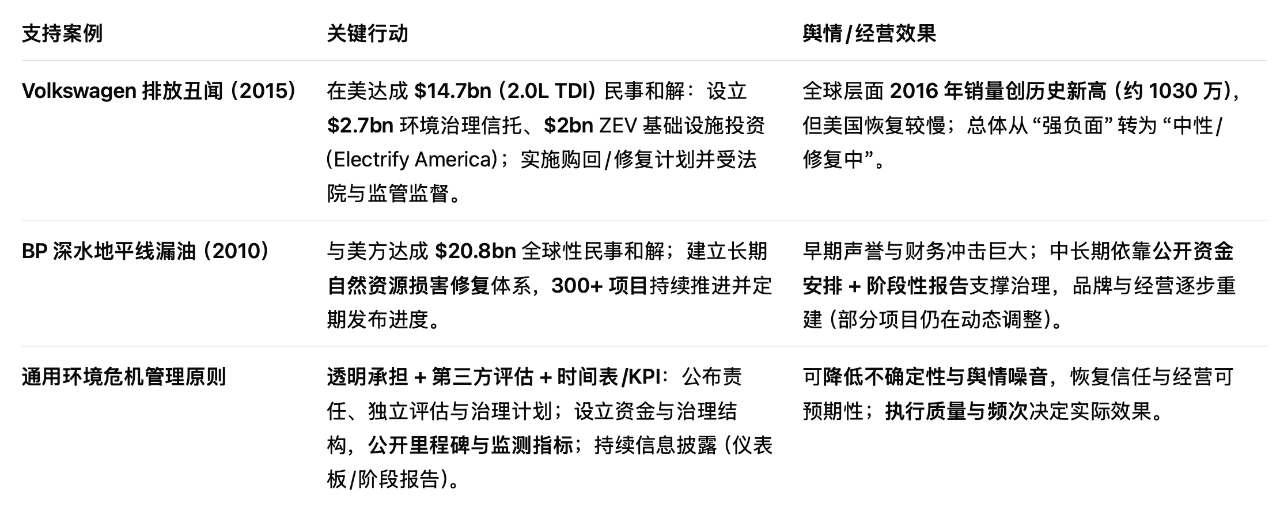 根据危机管理研究和类似品牌案例,及时透明披露修复计划(如第三方评估、修复KPI和阶段进度)有助于扭转舆情并控制冲击。