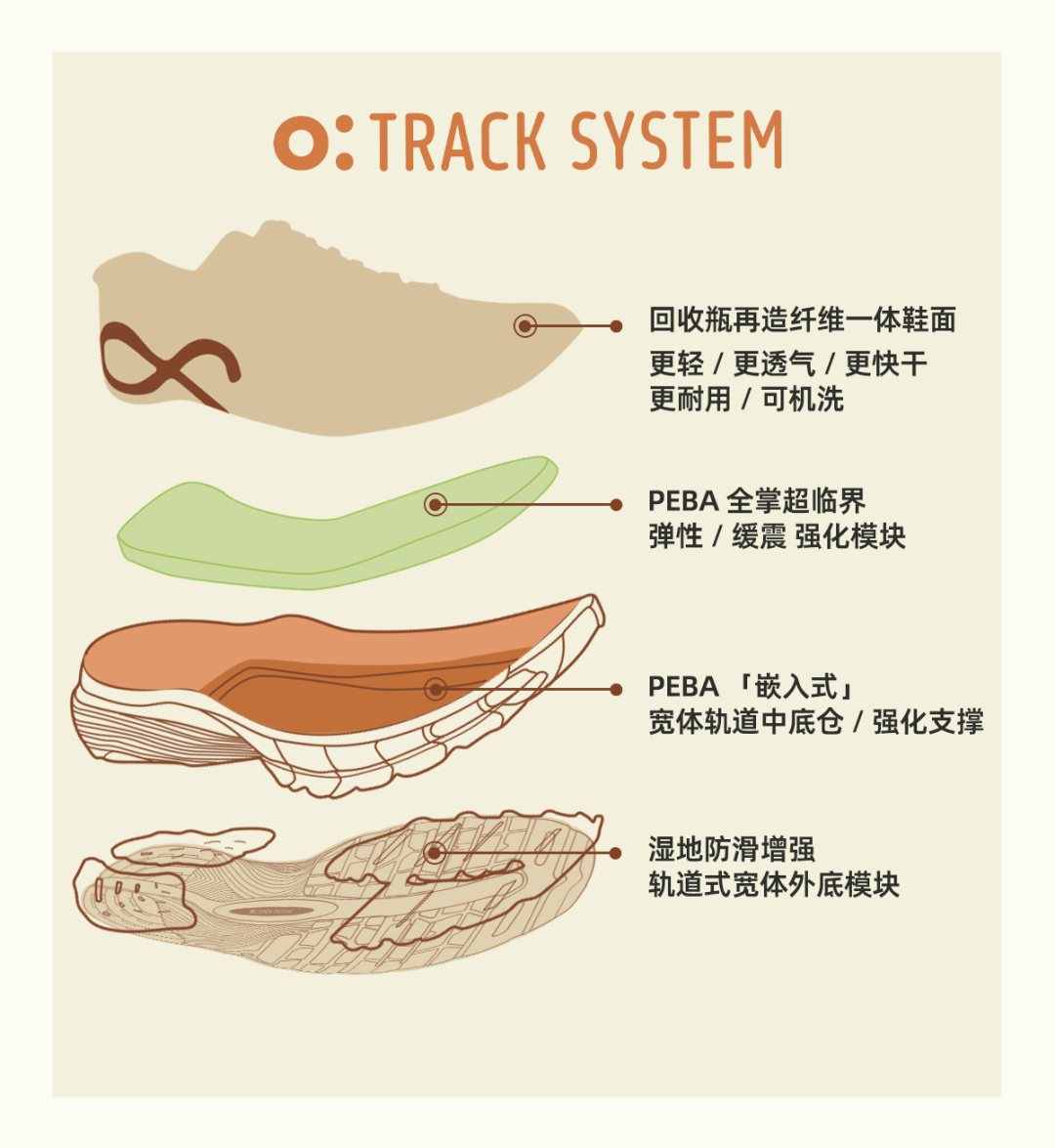 鞋底特别采用PEBA材质,让鞋子拥有强韧持久的弹性,而且更轻!(单只鞋子37码≈220g,42码≈260g)