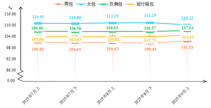 双肩包和旅行箱包价格指数涨幅居中,与中秋国庆双节前的备货需求直接相关,随着长假临近,出行需求增加,拉动相关品类箱包的市场消费。