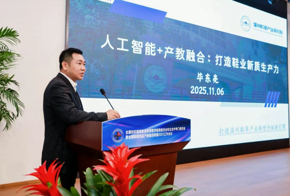 全国鞋服饰品产教融合联盟副秘书长、温州鞋革产业研究院副院长毕东亮在会议现场作《人工智能+产教融合:打造鞋业新质生产力》报告。