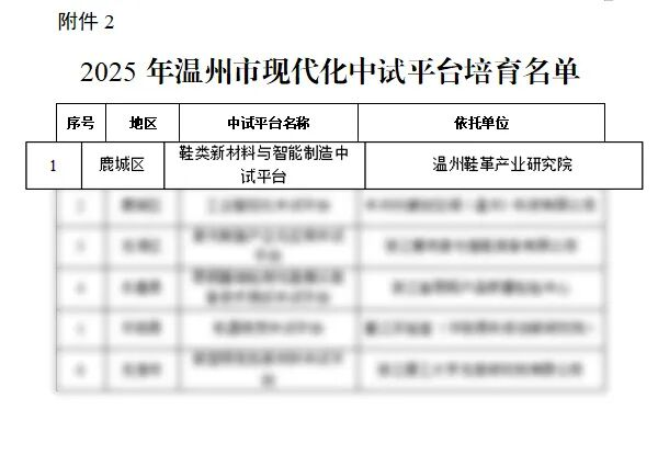 近日,2025年温州市现代化中试平台认定和培育名单公布,全市共18家单位入选。其中,温州鞋革产业研究院“鞋类新材料与智能制造中试平台”成功入选温州市现代化中试平台培育名单。