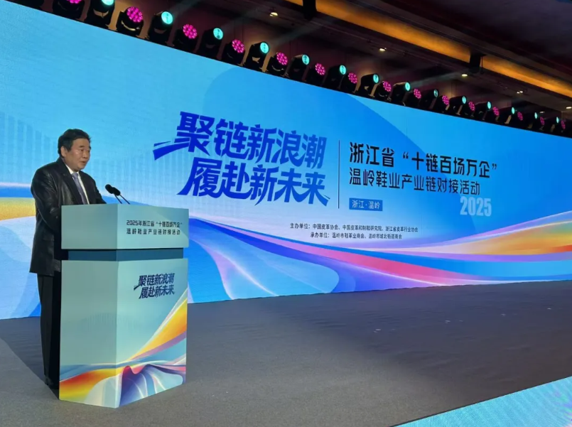 11月14日,以“聚链新浪潮 履赴新未来”为主题的2025年浙江省“十链百场万企”温岭鞋业产业链对接活动在温岭耀达国际大酒店举行。轻工业联合会副会长、皮革协会理事长李玉中,温岭市委常委、组织部部长林广,皮革制鞋研究院院长王文琪,浙江省经信厅二级调研员周金榜,温岭市人民政府副市长梁海涛,温岭市经济和信息化局党委书记、局长梁云庆,温岭市城北街道书记王俊杰,浙江省皮革行业协会书记、执行理事长李伟娟,河南省皮革行业协会书记、执行理事长朱岩,皮革协会秘书长张燕、副秘书长路华,全国制鞋标准化技术委员会秘书长桑军,陕西科技大学鞋服大数据与标准化研究中心主任罗向东,北京《瑞丽》杂志社时尚产业事业部总经理常晔等领导、嘉宾出席活动。