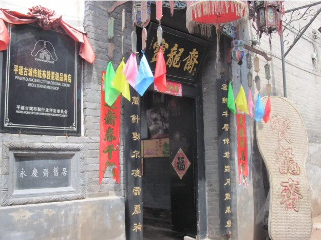平遥宝龙斋的前身“永庆斋”老字号,建于清代(1866年),设在古城明清街市楼南面,该老字号以实纳的千层底布鞋和花样丰富的绣花鞋闻名于世,深受小姐、太太、富豪、财东的喜欢。1937年永庆斋后裔侯宝库为承继祖先传统手艺,16岁到太原老字号鞋厂“美华新”拜师学艺,18岁成为工务主任。解放后,他被聘为平遥鞋厂设计师,屡获大奖,专为山西晋剧表演艺术家丁果仙、牛桂英等定制舞台专用鞋。第三代传人侯天龙于1984年创建宝龙制鞋厂,保留传统工艺并在制鞋工艺、款式、选料上加以创新。“平遥年”期间,宝龙斋展出一米八的巨型千层底布鞋,鞋底共纳了1068针,被誉为“布鞋王”。