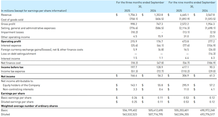 亚玛芬体育2025年第三季度营收17.56亿美元,同比增长30%;净利润大幅增长156%至1.43亿美元,调整后净利润激增161%至1.85亿美元。毛利率提升至56.8%,调整后毛利率达57.9%。