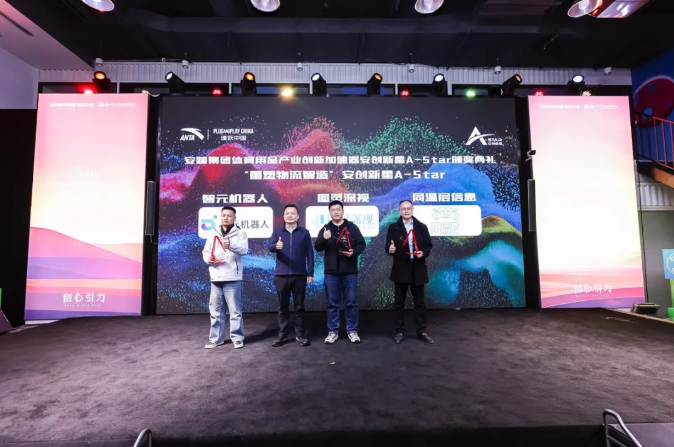 安踏集团鞋生产晋江区总经理雷世源(左二)为安踏集团体育用品产业创新加速器“重塑物流智造“赛道获胜企业颁奖