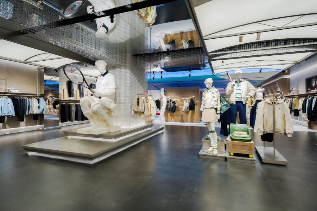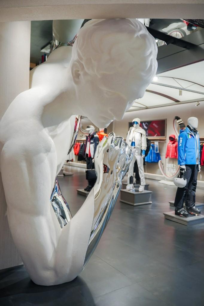 步入门店,以“意动永恒”为主题的专业运动区率先进入视野。这一区域以竞技力量元素与科技感的碰撞打造体验空间:入口的滑雪运动专区为空间注入米兰冰雪赛场的速度与激情;后场来到网球与高尔夫专区,与身披FILA经典网球单品BB1大满贯 POLO的雕塑《网球新章》其一再次相遇,感受古典艺术的现代张力,并探索品牌在网球领域的传承与拓新。