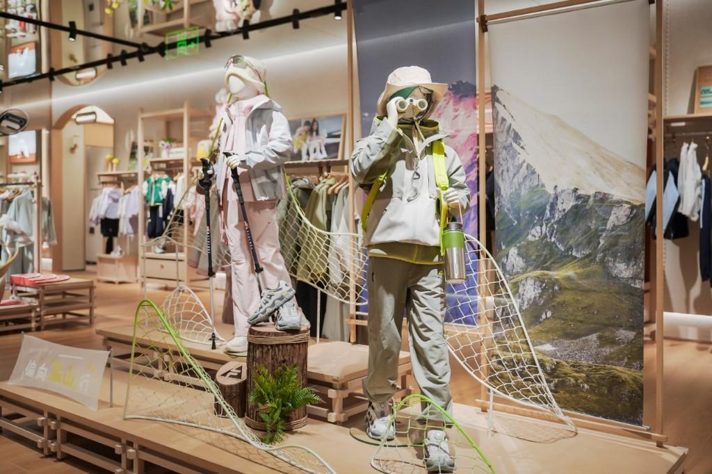 径直向前来到以“海丝逐浪”为空间主题的鞋履区。在这里,环球独航的宏大叙事与海上丝绸之路的历史及FILA百年探索的品牌精神融为一体。主体鞋墙取形于郑和宝船的龙骨结构,橡木直纹饰面与哑光金属共同构建出富有张力的力学秩序。品牌历史与顶部的镜面设计结合,巧妙地令消费者在光影中感受FILA百年传奇的交错重叠;而区域中央那艘复刻“FILA TRI号”的帆船装置,灵感来自FILA 赞助意大利帆船家吉奥瓦尼·索尔迪尼独自帆船航行大西洋116天的世界纪录,致敬其无畏的运动精神,亦象征着FILA以“破浪前行”之姿引领运动与时尚航程。