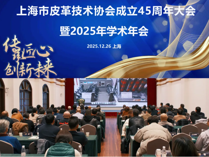 2025年12月26日,上海市皮革技术协会成立45周年大会暨2025年学会年会在上海科学会堂隆重召开。皮革协会副理事长陈占光、上海市科协二级巡视员潘祺,沪苏浙皖皮革行业协会领导,上海皮革行业资深专家,东华大学、嘉兴大学、上海工艺美术学院师生代表以及会员代表等100多人齐聚一堂,共庆协会45华诞,共探业技术创新与绿色发展之路。