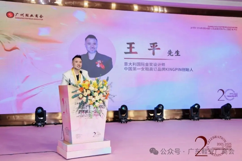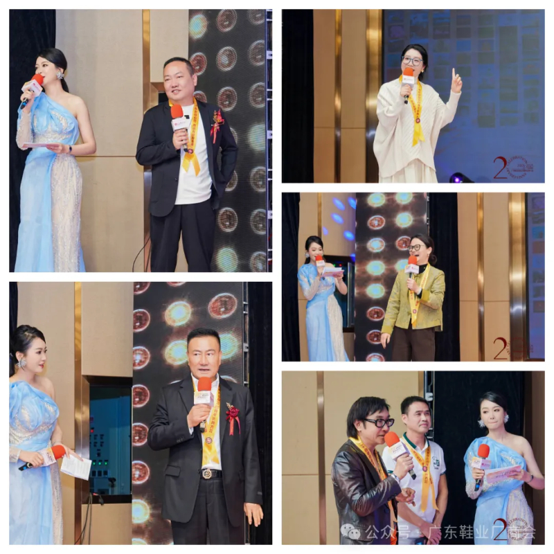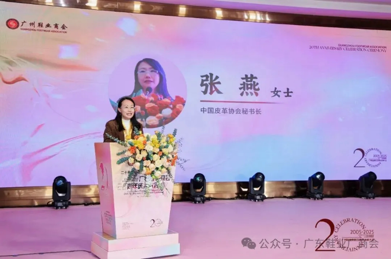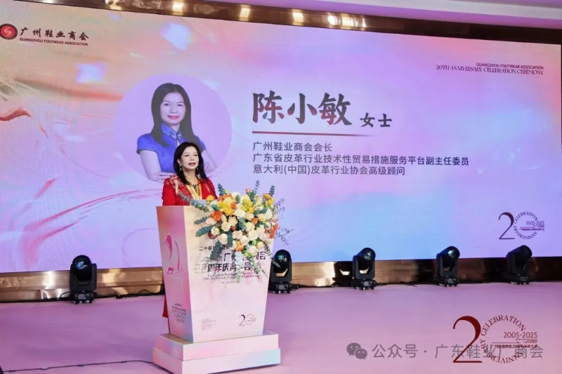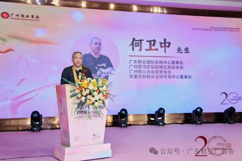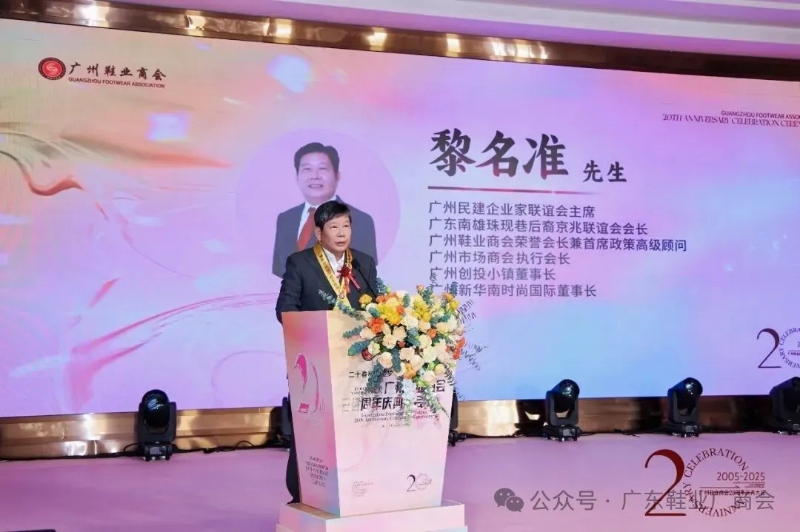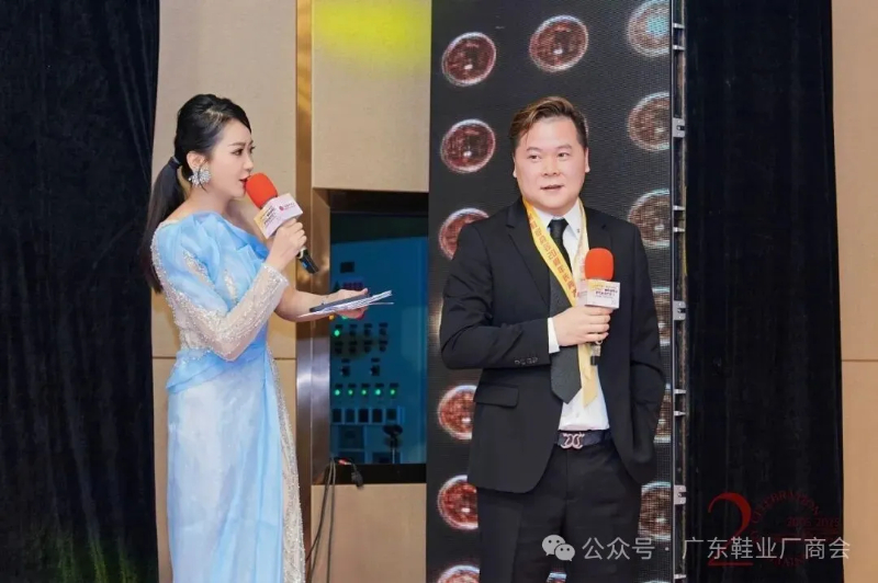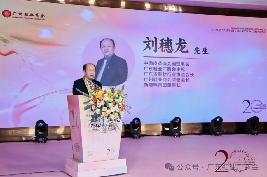 刘主席在致辞中表示,当晚群贤齐聚共庆,皮革协会、广东鞋业厂商会等单位代表到场致以祝贺与敬意,肯定其二十载发展成果;广州鞋业历经多年发展,已形成从研发设计到销售服务的完整产业链,在全球市场占据重要地位,更在国家 “一带一路” 倡议下成为全球鞋业贸易关键枢纽;回望商会二十年征程,其始终与会员同心应对市场风云、行业波动及疫情等挑战,以坚韧担当筑牢产业根基;站在新起点,面对数字经济与消费升级机遇,各方坚信在政府支持与商会引领下,全体同仁秉持创新、深耕品质、聚力智创,必将推动广州鞋业续写高质量发展新篇章。