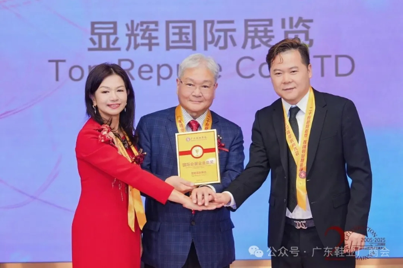 ▲广东鞋业厂商会会长许容金,广州鞋业商会会长陈小敏为显辉国际展览颁发“国际会展业金鼎奖”