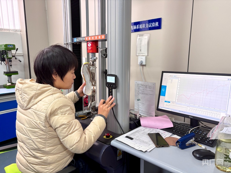 河南红晟鞋业有限公司工作人员正在对鞋底和鞋面粘和处进行拉力测试(央广网记者 张丽娜 摄)