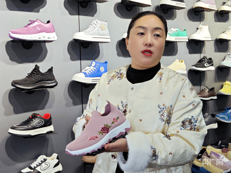 洛阳保书工贸有限公司负责人展示深受欧美市场欢迎的一款刺绣布鞋(央广网记者 张丽娜 摄)
