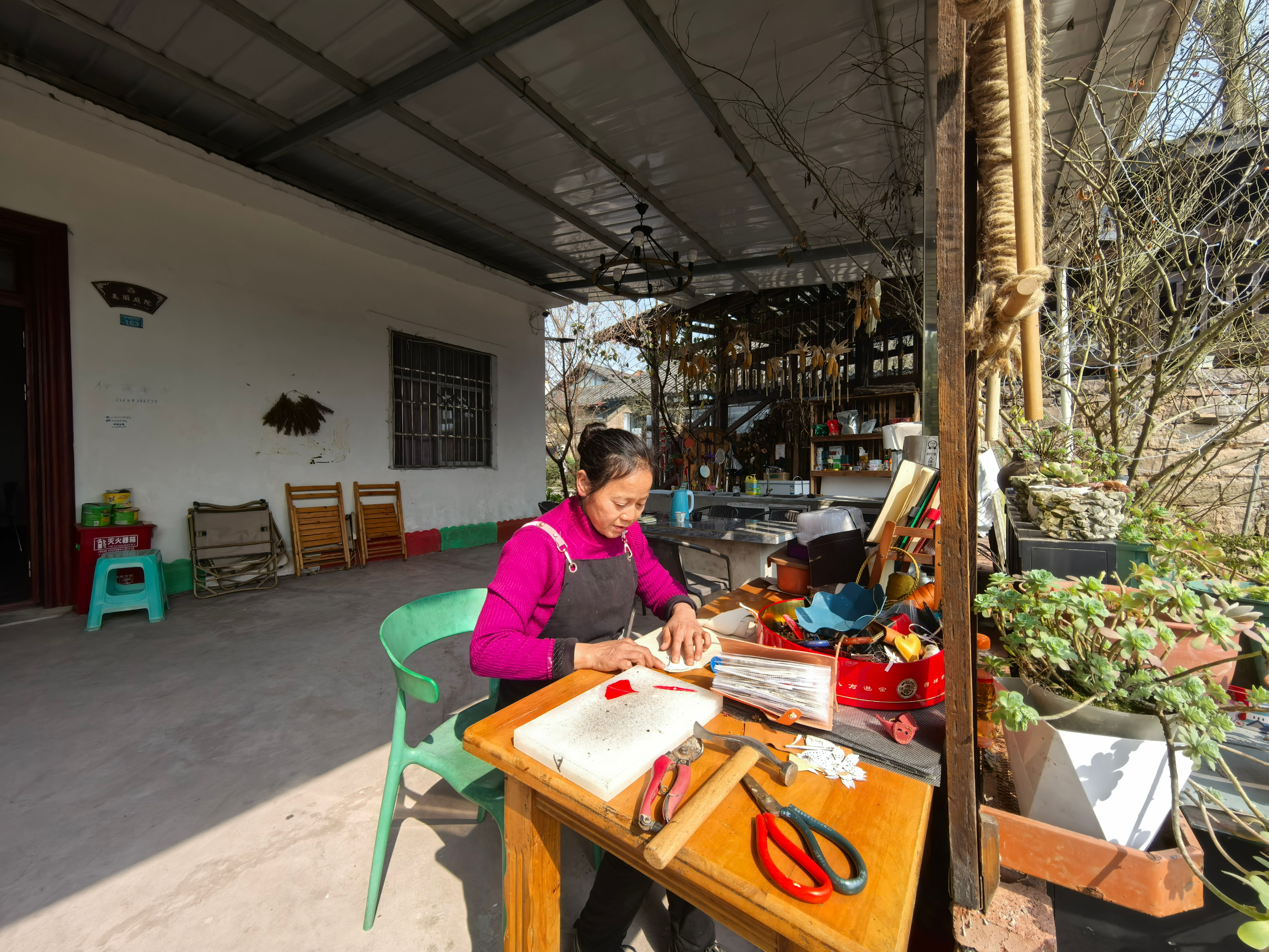甘遐学的皮革手工室就在将军村的角落,偏安一隅,甚是安静,但恰恰适合来这里享受乡村恬静,户外野趣的游客。“用现在时髦的话说,我也是‘主理人’了。”虽年过半百,但甘遐学乐于接受新鲜事物,曾经做过30年皮鞋厂女工的她,随着艺术院落建成,她留在家乡工作,不仅当过咖啡师,还拾起在皮鞋厂工作的老本行,成为一名“皮革艺人”,如今她又把自家的院落拾掇出来,成为了民宿和“皮革工作室”的“主理人”。