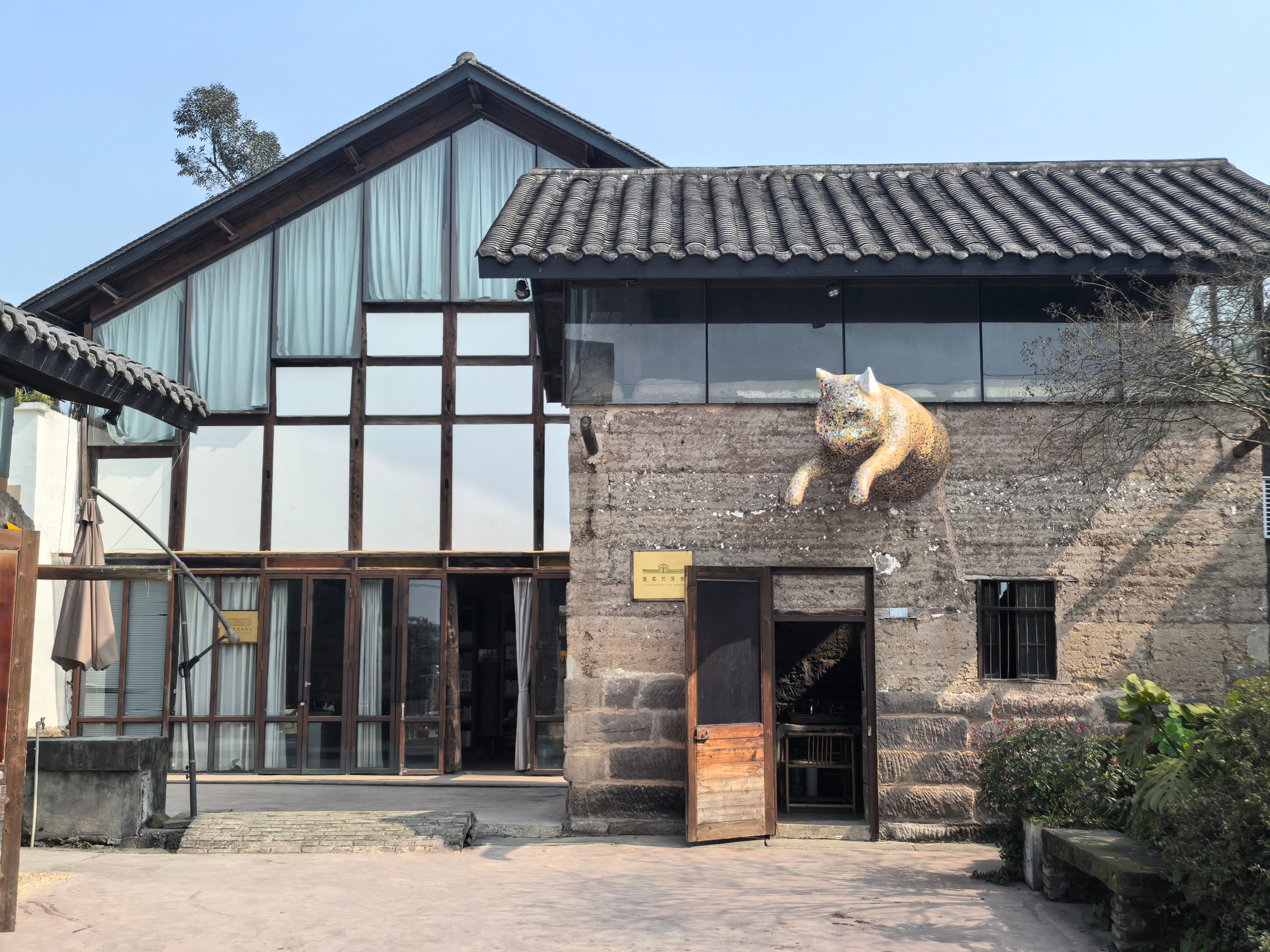 “大青蛙”餐馆使用的土坯房,之前已闲置十余年,当时房椽垮塌,青瓦散落一地。在艺术家的设计下,老屋用钢构结构进行了加固,在外墙上加筑玻璃增加采光,并重覆青瓦,焕然一新。