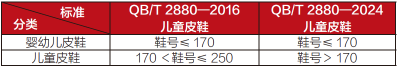 24版标准更改了“儿童皮鞋”的定义,与16版标准相比,最大的变化是放开了儿童鞋鞋号的上限。因为随着生活水平的提高,儿童和青少年的脚大小已发生了较大的变化,对250以上鞋子的需求已见规模,原有儿童皮鞋定义中的鞋号范围“不大于250”易造成鞋号大于250的童鞋缺少质量监管的问题。因此,新标准根据童鞋市场现状,对定义进行了相应的修改。鞋号对比具体内容见表1。