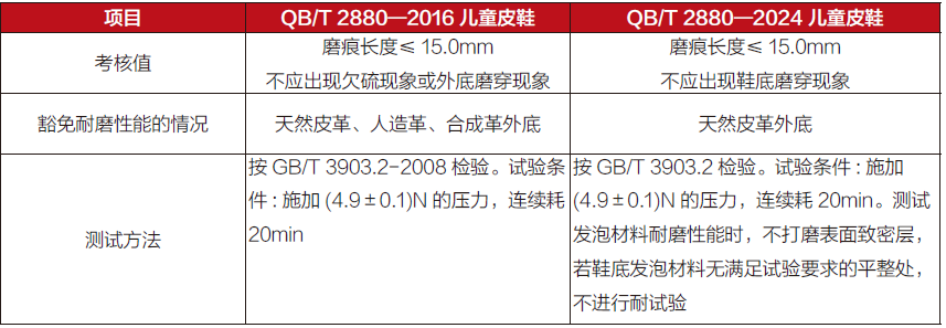 随着儿童皮鞋设计和生产的发展,鞋底的材质、结构越来越多样化、个性化,已不仅仅局限于传统的单一材质鞋底,对于越来越多的复合鞋底结构,16版标准原有的“外底磨穿”在判定时易存在歧义,因此24版标准更改为“鞋底磨穿”;考虑到“合成革”或“人造革”作为外底时,若不对其耐磨性能进行限定,可能会导致鞋产品外底磨损影响穿用的问题,因此24版标准在不测耐磨性能的情况中删除“合成革、人造革外底”。