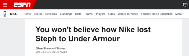 2016年,ESPN借着库里商业价值水涨船高的东风爆出惊天内幕——为什么库里在2013年选择了签约安德玛而不是耐克。