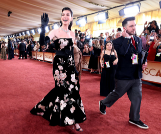 Anne Hathaway在红毯盛典上微微露出她脚上那双Roger Vivier珠宝镶嵌凉鞋,搭配的是Alessandro Michele设计的Valentino 2026春季系列花卉高定礼服。在5月1日《穿普拉达的恶魔》续集上映前夕,这位女演员与电影原型——时尚女魔头Anna Wintour同台,重现了影片中的经典时刻,成为全场焦点。