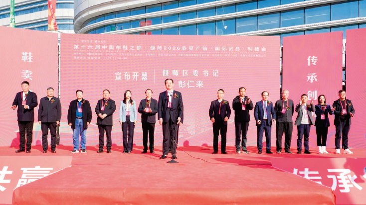 11月26—28日,第十六届布鞋之都·偃师2026春夏产销国际贸易对接会在洛阳偃师循环经济示范产业园举办。430家鞋业单位、36家鞋机鞋材展商携新产品、新技术亮相,搭建起高效对接平台,展现了“布鞋之都”的行业凝聚力。偃师区委书记彭仁来宣布开幕。