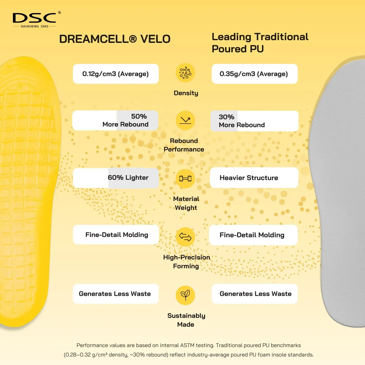 高性能泡沫制造商 DSC 刚刚发布了数据,称其 Dreamcell Velo 有望取代行业标准的浇注型聚氨酯(PU)鞋垫,成为消费者的最爱。去年 8 月, DSC 推出了 Dreamcell Velo,其配方比传统浇注型 PU 轻 60%。现在,根据技术数据,该产品已成为 “性能类别中的明显领先者”。