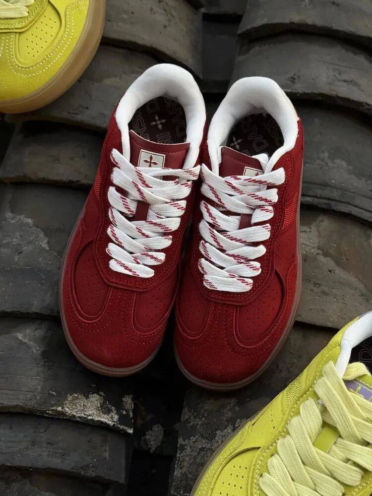 麂皮与皮革拼接的细腻质感,让红色更显高级沉稳,上脚瞬间提亮全身穿搭。