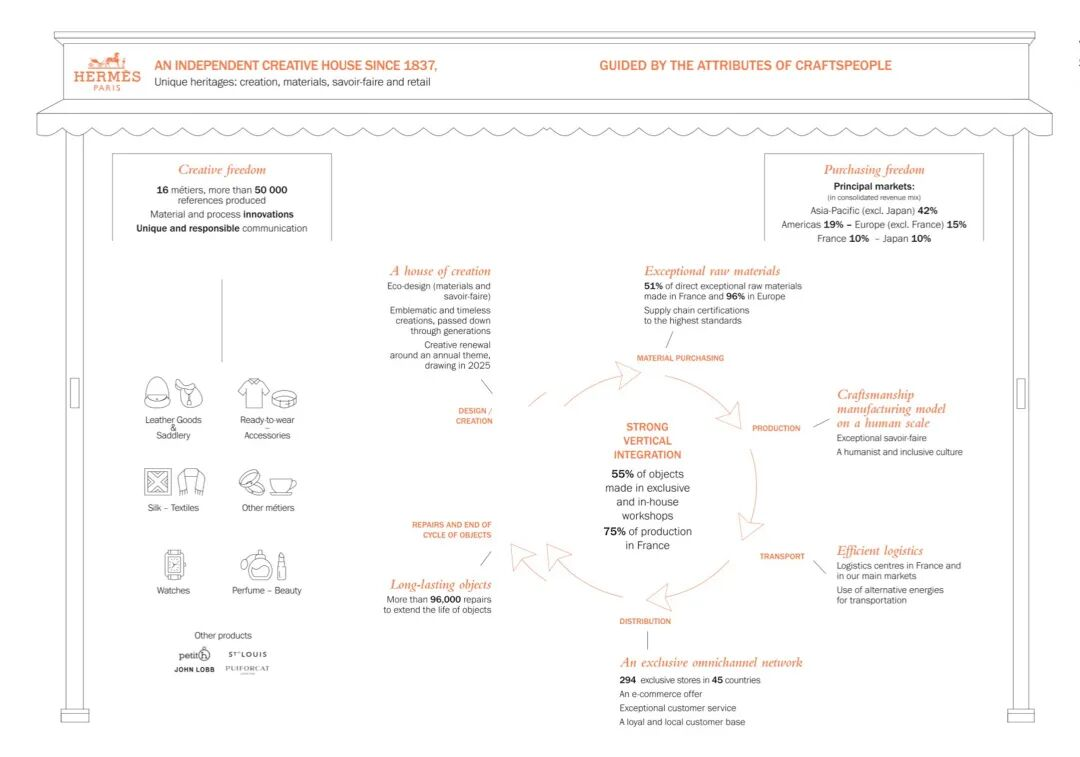 本文的结尾,《华丽志》特别选取了爱马仕最新年度报告中三份信息含量极高的图表来阐释爱马仕核心供应链的全球布局情况,包括 :1)爱马仕高度垂直整合的商业模式 2)爱马仕法国本土的重资产产能版图 3)爱马仕价值链全景生态图